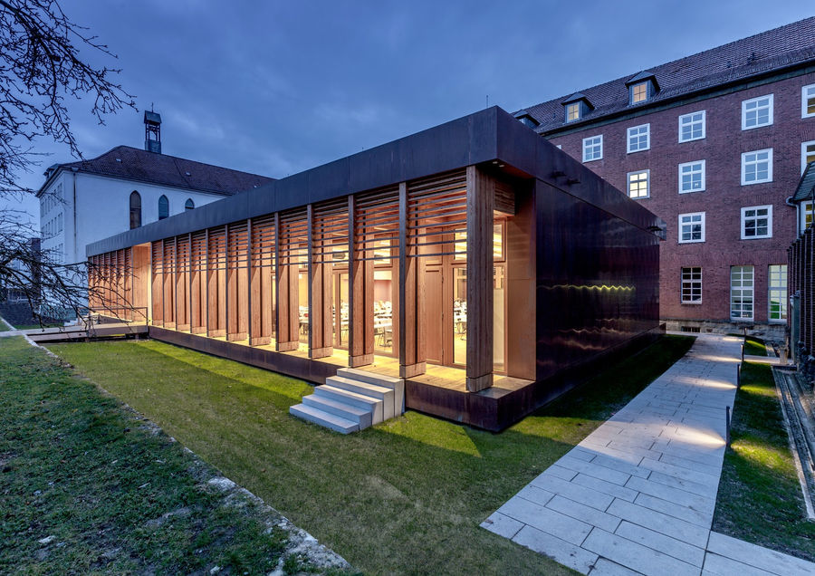 Designed to harmonize with the existing architecture, the new structure delicately rises above ground level, exuding an aura of lightness amidst the solidity of surrounding walls and portals. Accessible from both the park and the main building, the new facility prioritizes inclusivity with barrier-free entrances. Inside, wooden feautures provide warmth and acoustic comfort. Floor-to-ceiling glass panels on its facades infuse teaching spaces with natural light while versatile partition walls ensure flexibility in teaching methodologies.